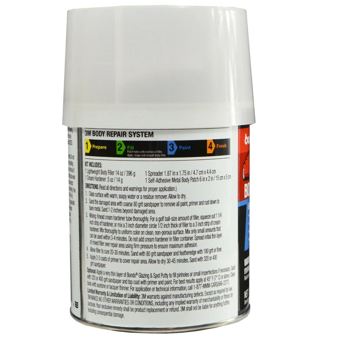 This Bondo Body Repair Kit contains everything you need to repair dents, rust holes, scratches and more on vehicle bodies and panels. Along with step-by-step instructions, this kit contains Red Cream Hardener, a Self-Adhesive Metal Body Patch, a spreader and the original Bondo Body Filler – the materials used by collision repair pros, in a money-saving kit for auto body repairs large and small.