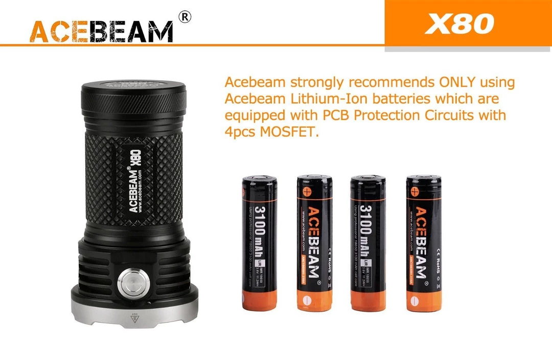 - Max 25000 lumens output by using 4 * 18650 Acebeam High Drain lithium rechargeable batteries;