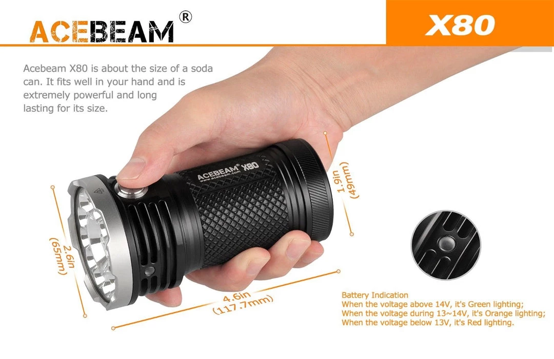 - Underwater 30 meters(The X80 is the most durable flashlight yet produced by Acebeam,