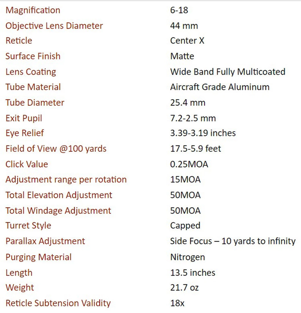 - NEOS 6-18×44: Athlon 216012 has Athlon Center X reticle in it.