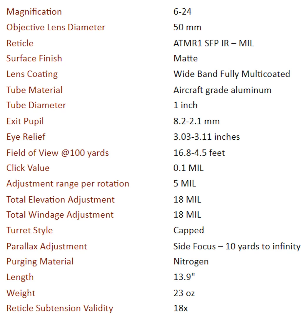 - TALOS 6-24×50: Athlon 215013 has ATMR1 second focal plane illuminated reticle in it.