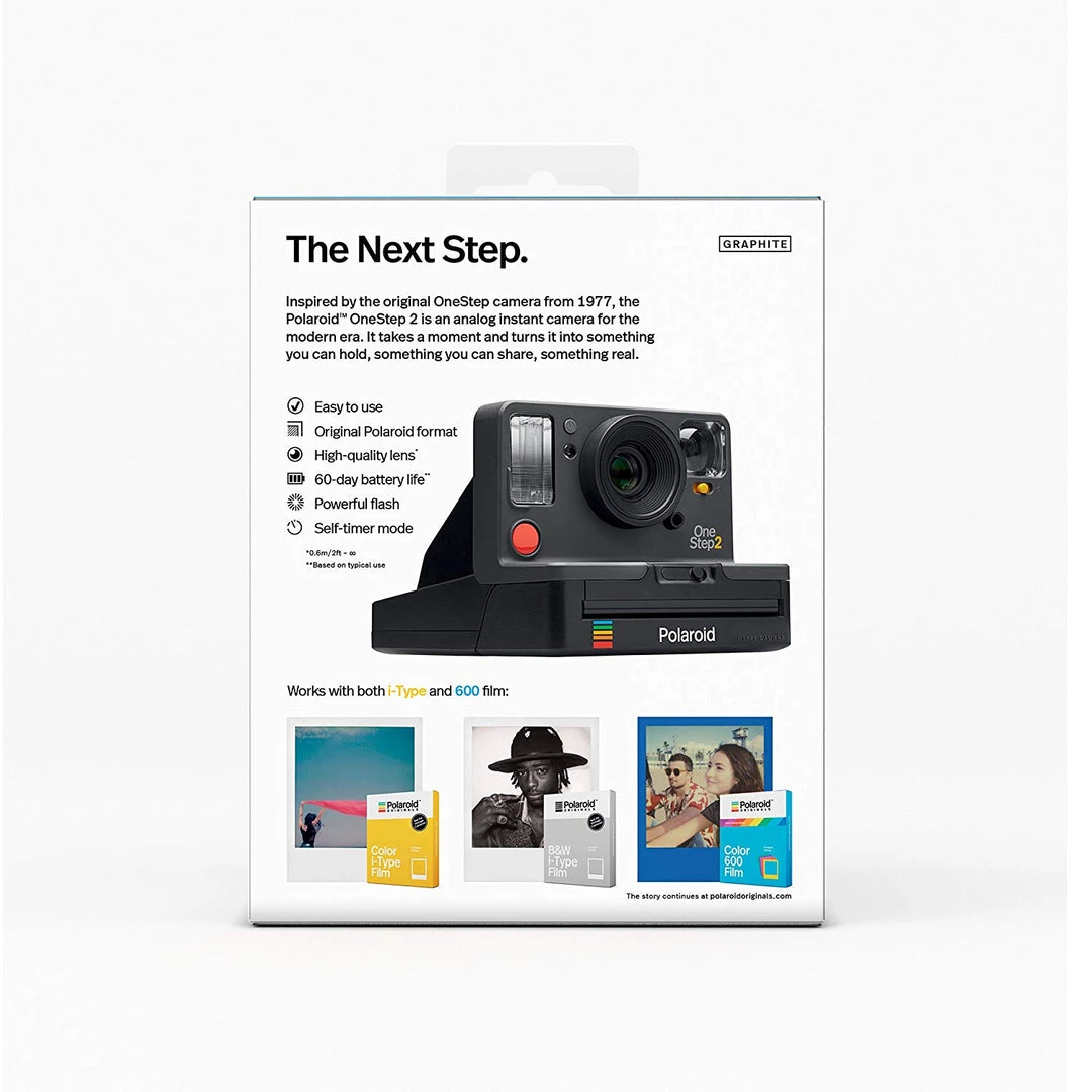 The OneStep 2 is a new Polaroid camera that blends classic design with contemporary style. It’s inspired by Polaroid’s original OneStep, but updated to create a simple, easy-to-use instant camera that works straight out of the box – just pick up some i-Type instant film and you’re good to go. It’s got a high quality lens and a powerful flash to give you great photos every time, and this newly improved Viewfinder model makes framing your photos even more intuitive than before. Plus with its long-lasting rechargeable battery, you’ll always be ready to shoot, whether you’re on a brief excursion or a journey round the world.