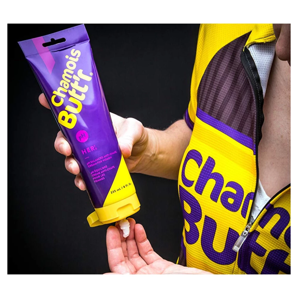 Chamois Butt’r Her’ is a non-greasy skin lubricant developed by cyclists for use with all chamois. It immediately improves riding comfort & soothes already chafed or irritated skin. Chamois Butt’r Her’ was developed by a female sports medicine physician in cooperation with professional women cyclists. Her’ utilizes premium ingredients including aloe vera, green tea leaf extract, tea tree oil, shea butter, and lavender oil for their naturally occurring beneficial properties. All Chamois Butt’r products are safe for women and men, but Her’ is pH balanced for women. Apply liberally to skin and/or chamois before each ride. May be applied to any skin areas that rub together or against clothing. Apply to skin to soothe & soften.