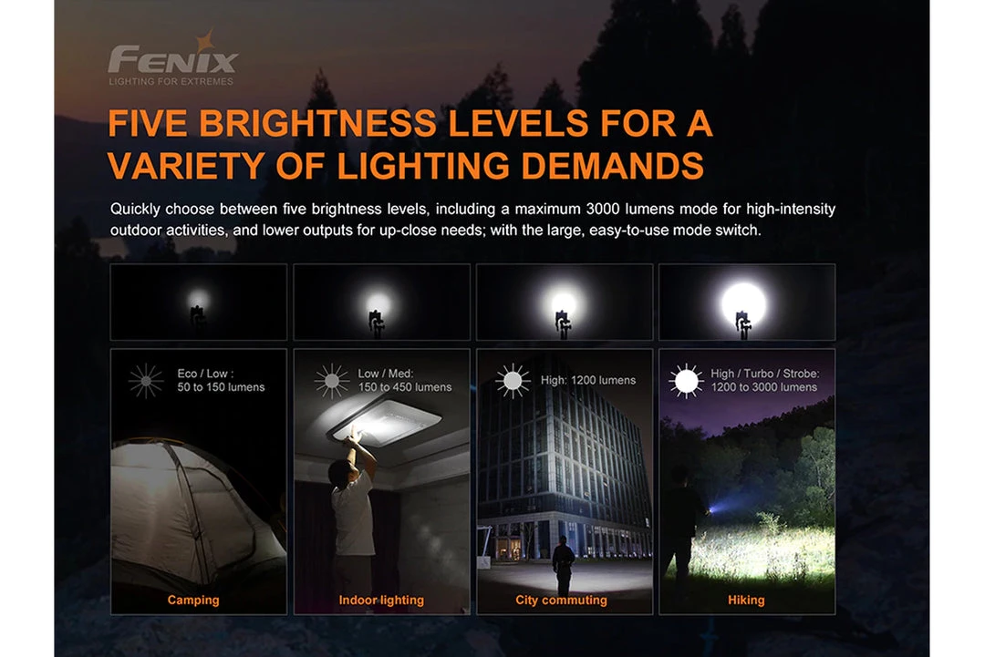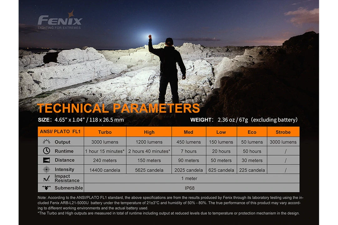 - Turbo 3000 Lumens/1.1 Hours/787 Feet