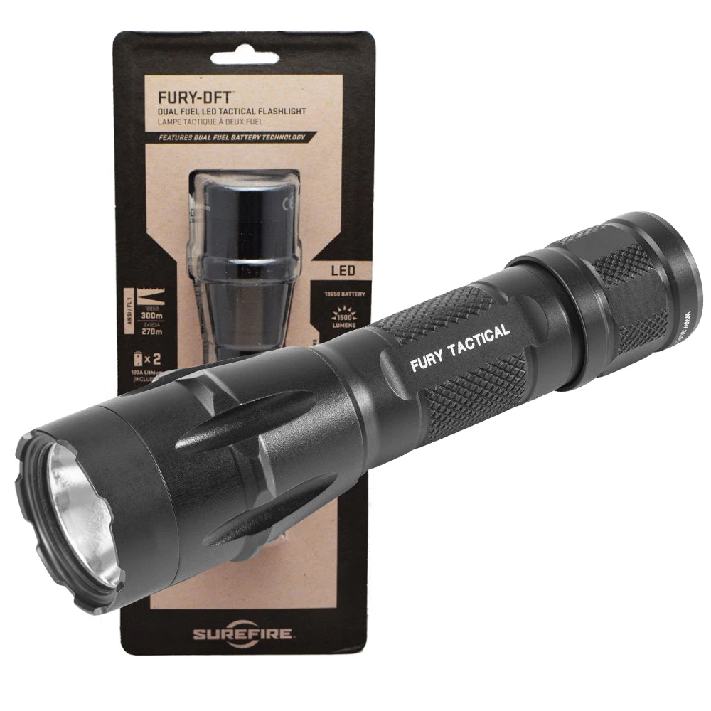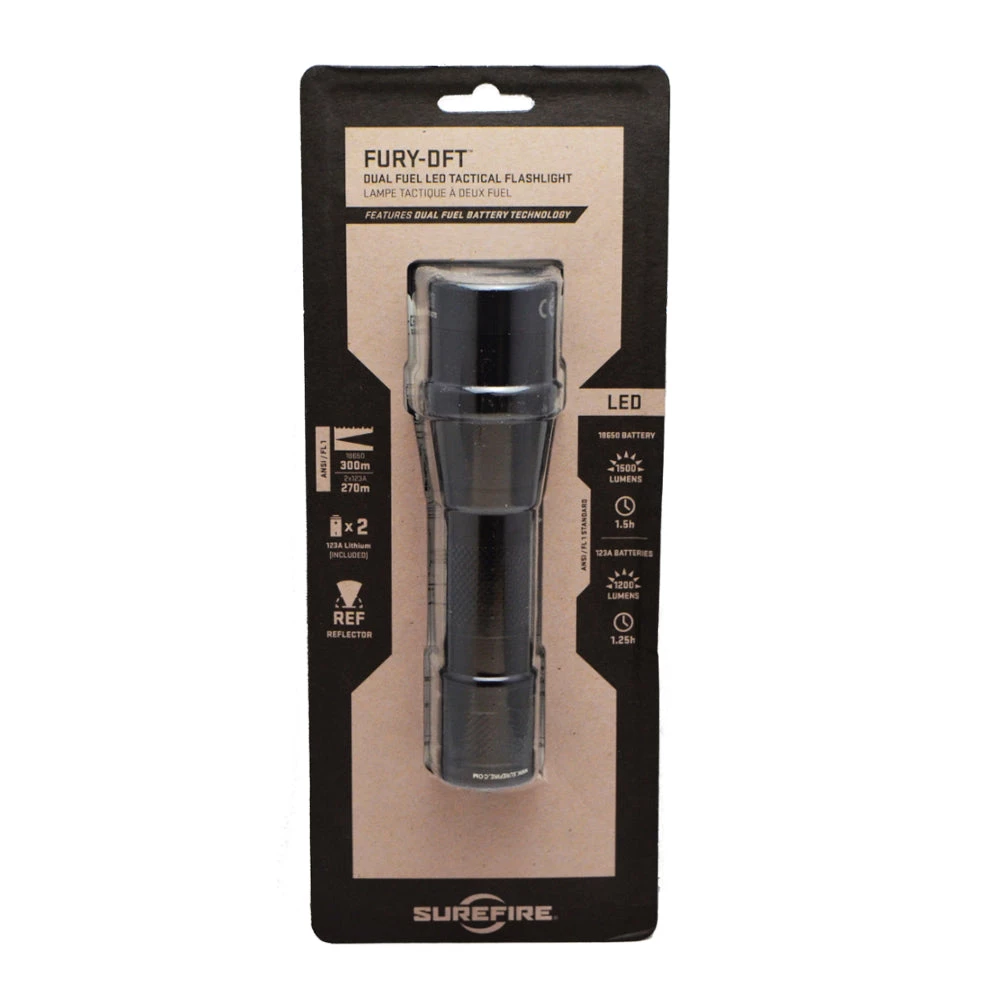 The “DFT” stands for dual fuel tactical with a single-output 1,500* lumen light that can also function as a searchlight. The dual-fuel feature means the light can be powered by either two 123A lithium batteries or a single economical 18650 lithium-ion rechargeable battery.