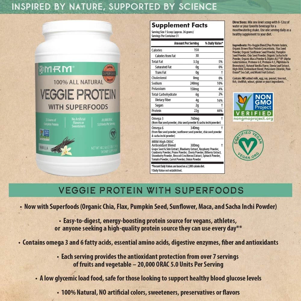 MRM Veggie Protein Powder with Superfoods, Vegan and Non-GMO, Vanilla 40.2 oz