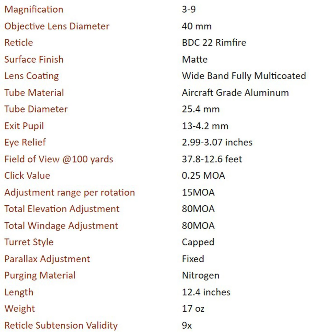- NEOS 3-9×40: Athlon 216003 has Athlon BDC 22 Rimfire reticle in it.
