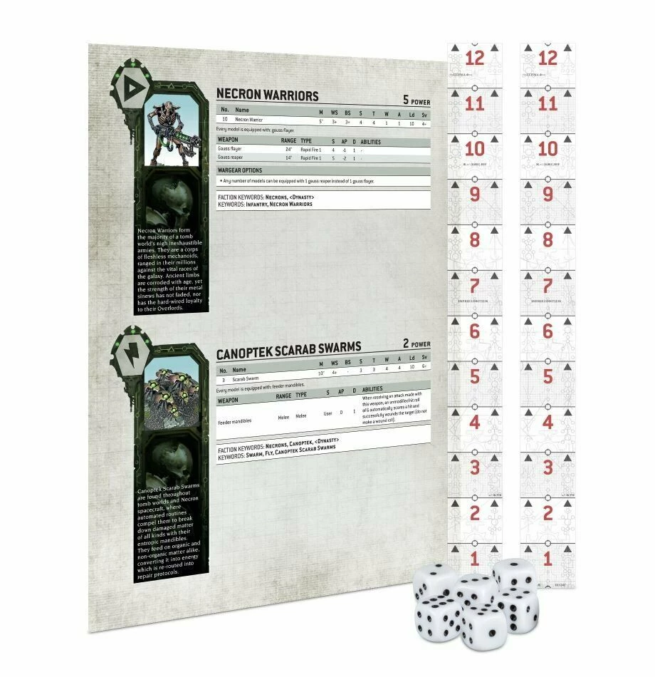 - (10) Necron Warriors: The mainstay of the Necron phalanxes, these bipedal warriors obliterate their prey with relentless volleys of atomising gauss weaponry. Each model comes supplied with a Citadel 32mm Round Base and a choice of heads and weapons.