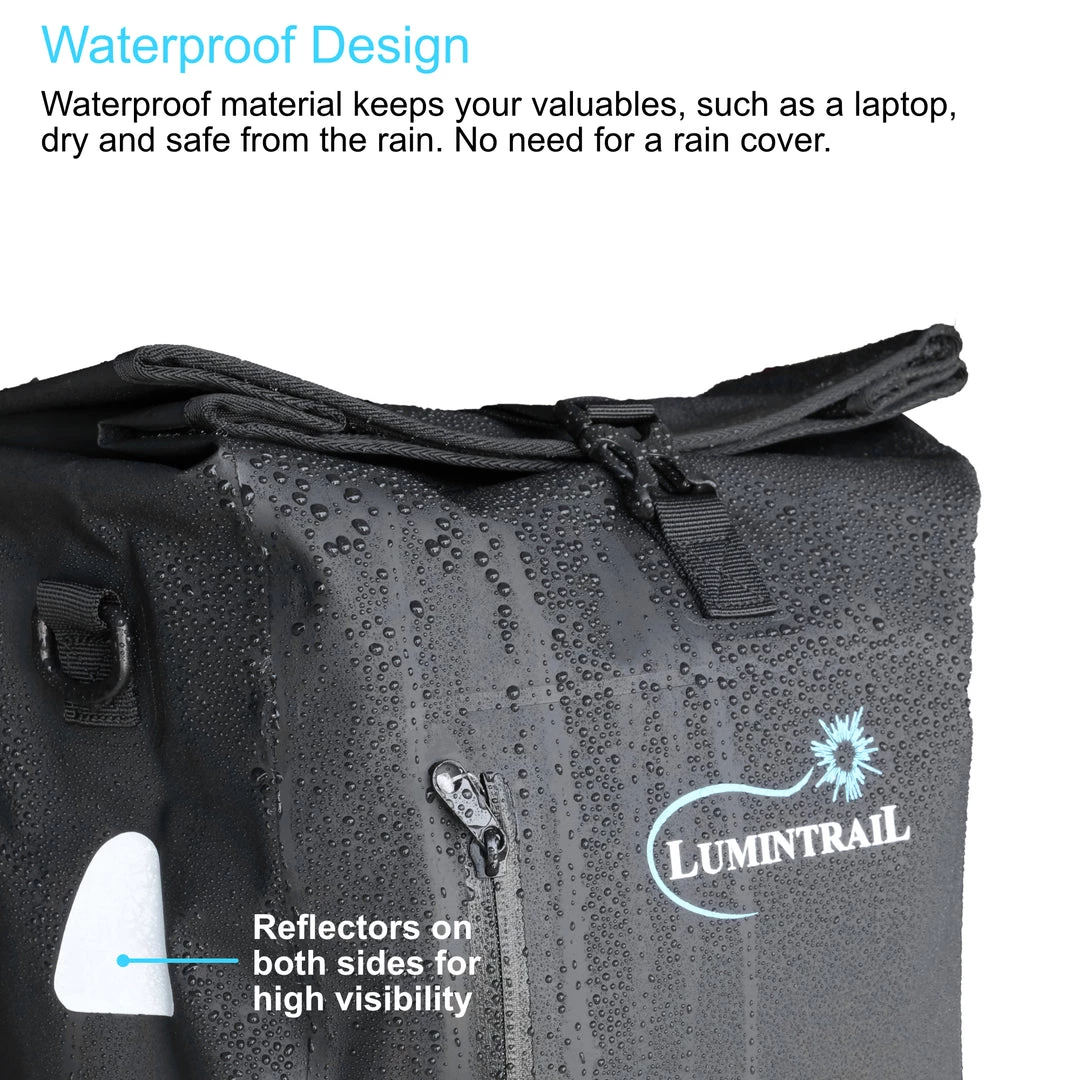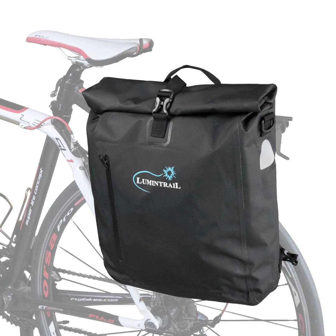 The Lumintrail Pannier Bike Bag and Backpack has two sizes: a large 25L and a medium 18L. Both are equipped with the clip on attachment system, laptop storage compartment, and padded straps for carrying off the bike. A must have for the daily commuter.