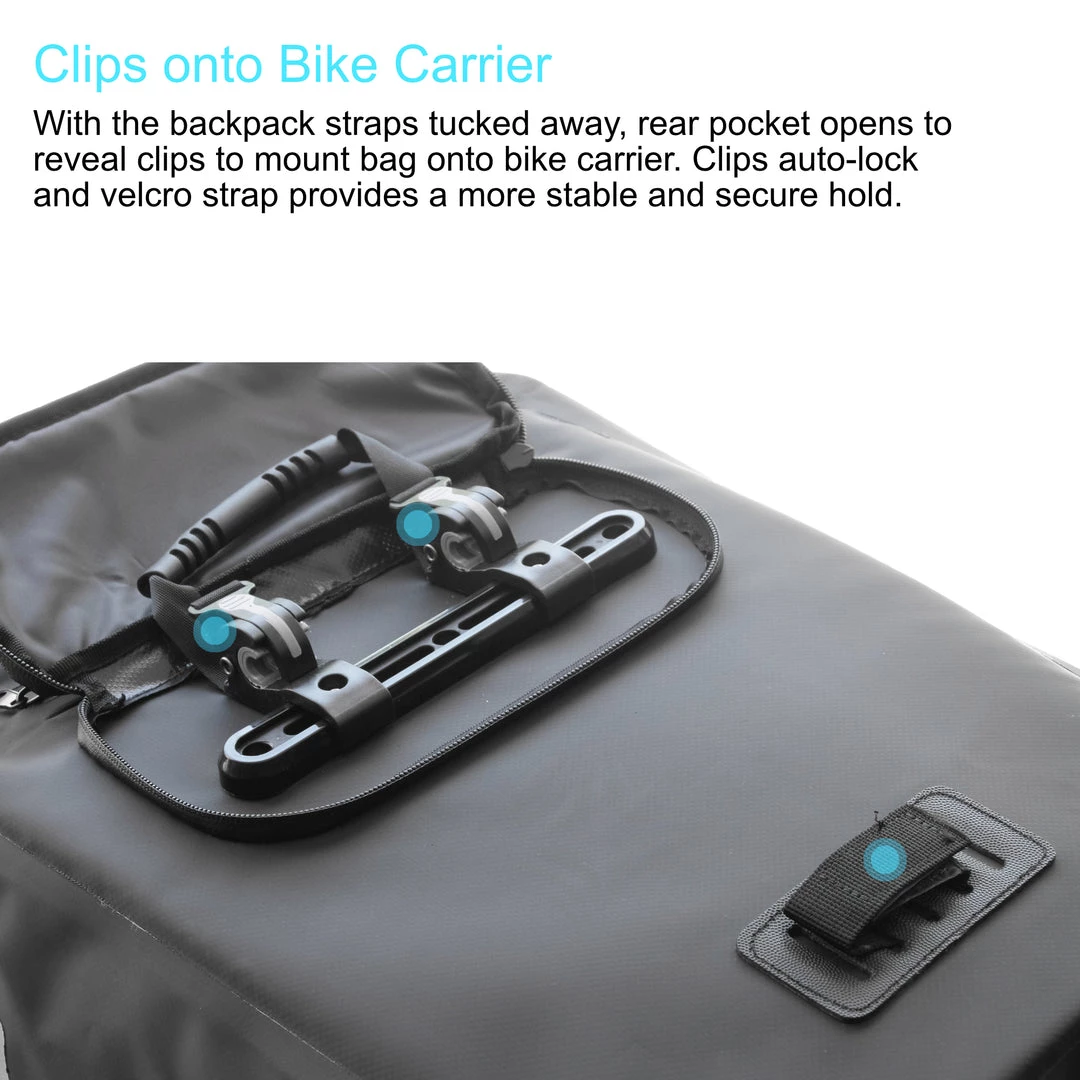 - SAFE & SECURE: A universal clip on attachment system allows you to attach this bag to any rear bike rack with ease while providing maximum security. Comes with adapter to fit onto e-bikes. Reflective strips on the bag ensures night time riding safety