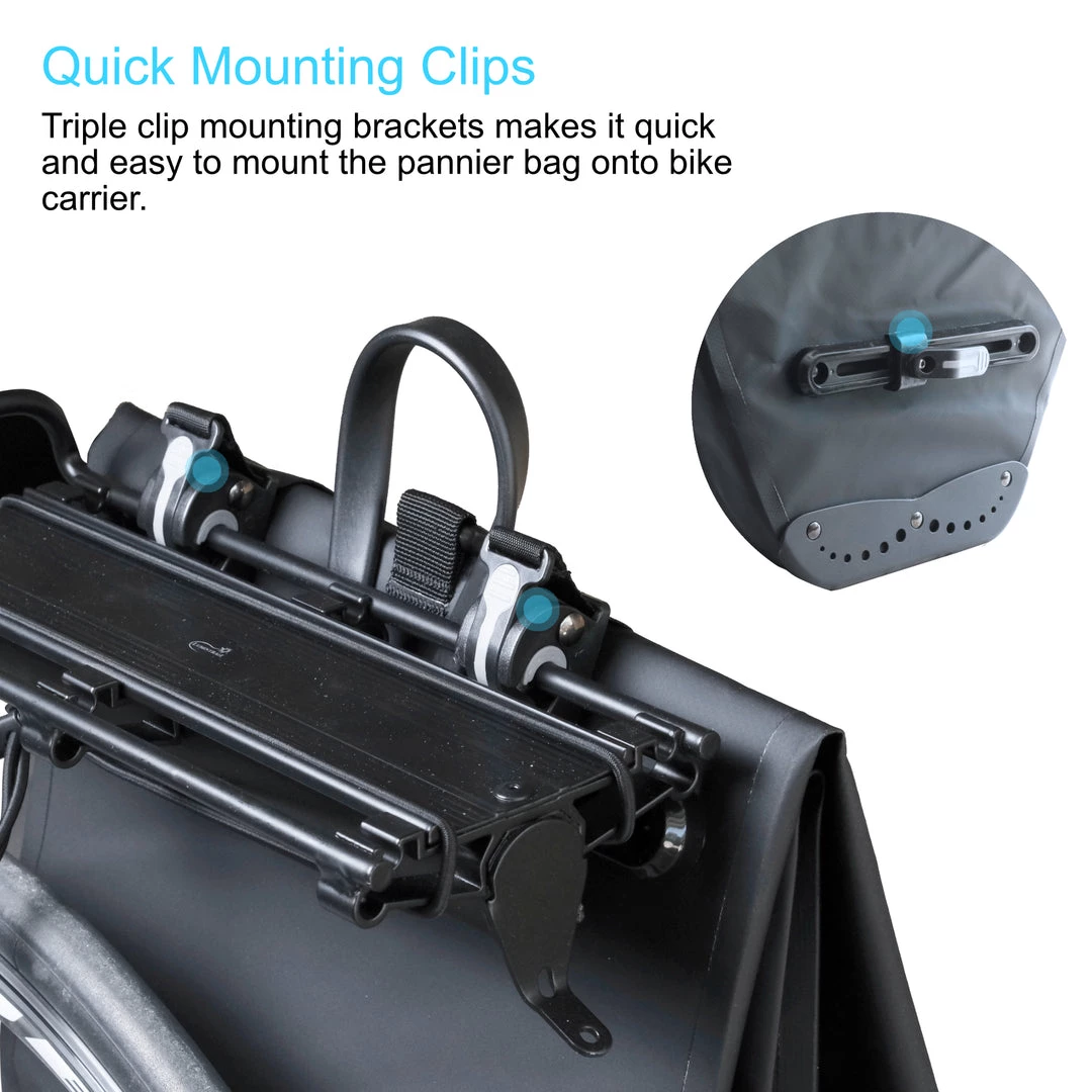 - SAFE & SECURE: A universal clip on attachment system allows you to attach this bag to any rear bike rack with ease while providing maximum security. Comes with adapter to fit onto e-bikes. Two reflective strips on the bag ensures night time riding safety
