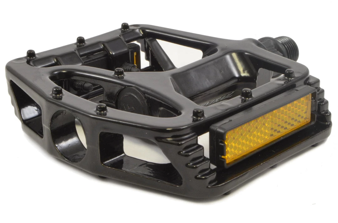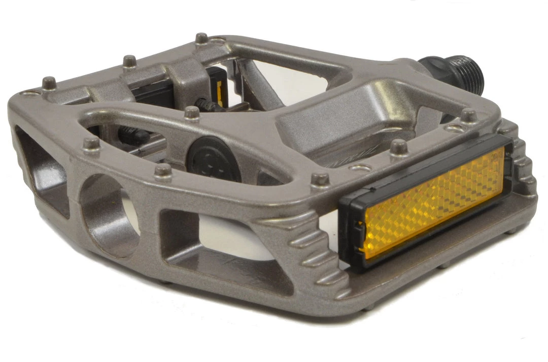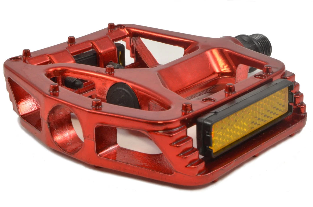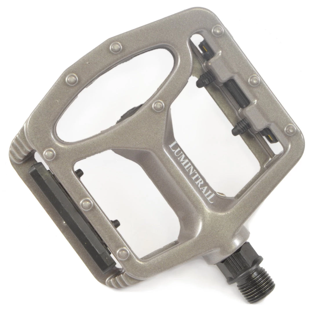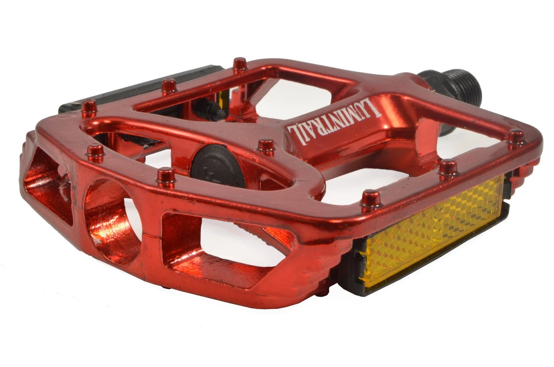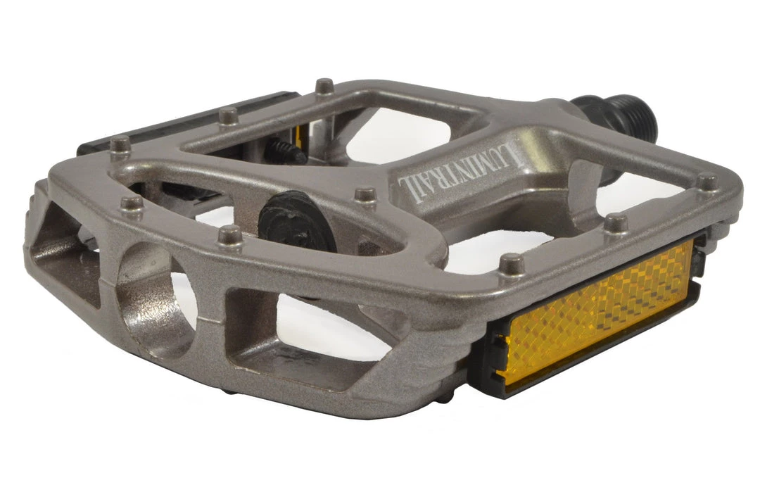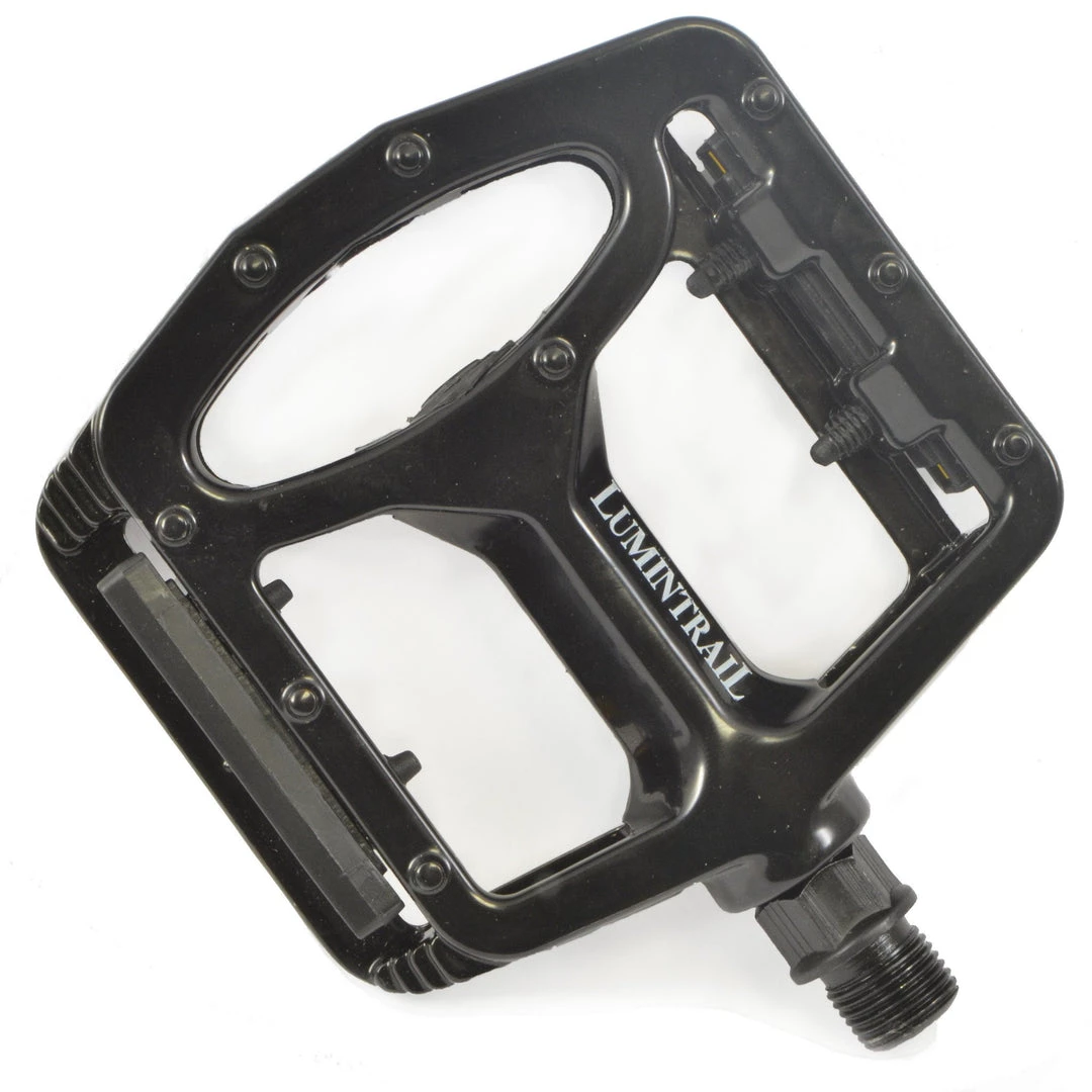 TheΒ Lumintrail LightweightΒ pedal with anti-skid pins is the ideal platform pedal for road racing, cross country, and recreational cycling, offering an enhanced riding experience. The large wider pedal platform provides solid foot/pedal stability, with wider cleats and binding mechanism for better shoe/pedal contact than traditional pedal systems. Crafted of solid and lightweight aluminum alloy, the LuminTrail platform pedal provides a long lasting and durable component to your bike. Sharp anodized metallic finish in a variety of colors. Removable safety reflectors are included and installed.