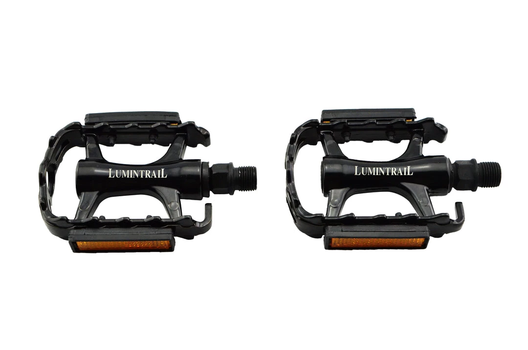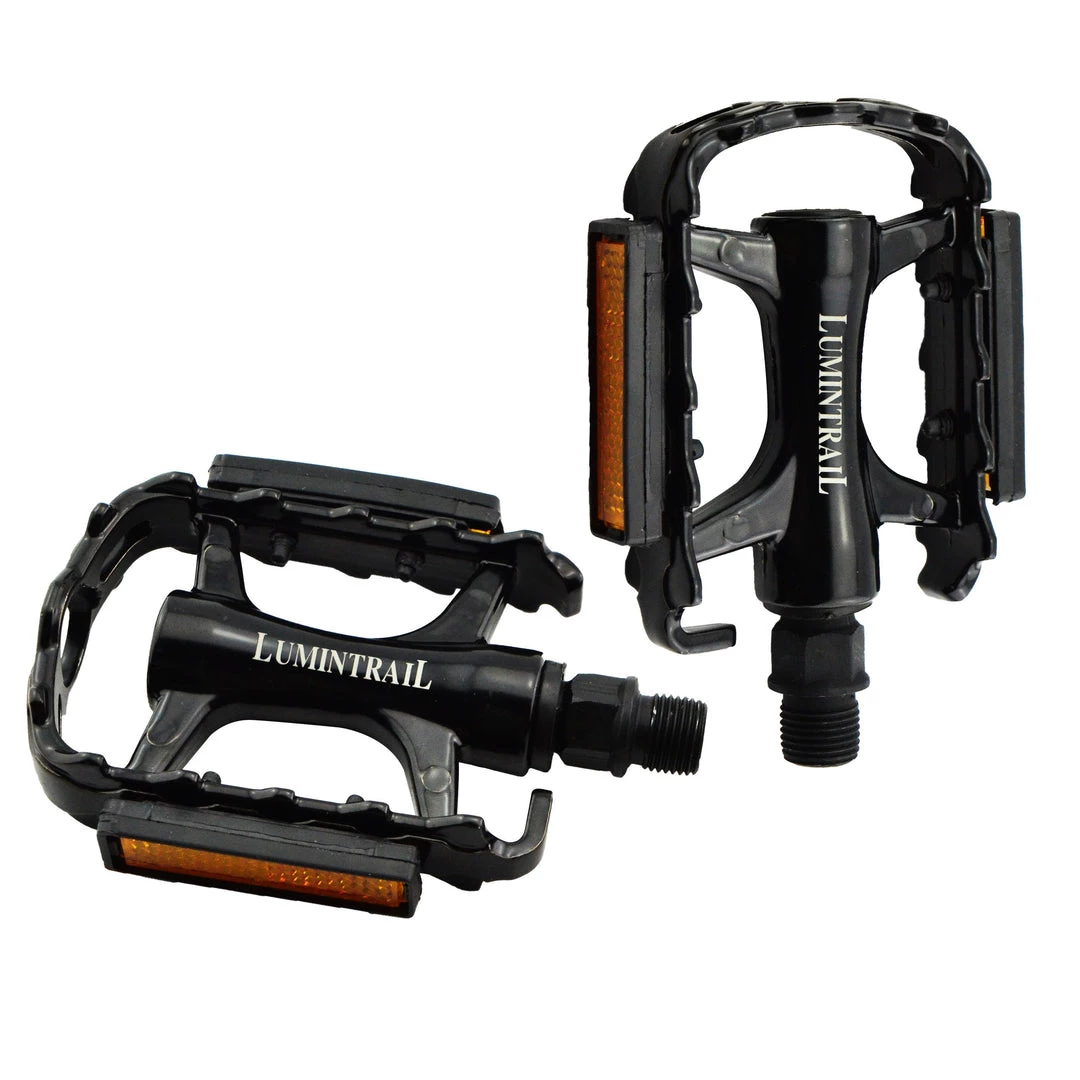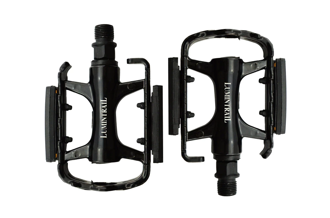 Ride for hours with these durable non-slip pedals. With built-in reflectors that allow for increased visibility in low light conditions, your rides can last longer into the day, making it safer to ride at night. The pedals are clearly marked with “R” and “L” stickers, making installation a breeze. These pedals are great for most bikes, fitting a 9/16″ spindle and are versatile for a multiple different kinds of rides whether for the road, on trails and even into the mountain biking treks. These pedals are great for riders who are frustrated with their feet slipping off of other less durable pedals, now have peace of mind that your feet are steady and secure in these Lumintrail pedals.