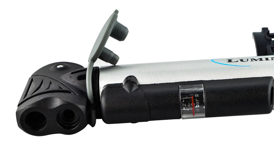 The Powerful pump features a dual nozzle head for Presta and Schrader with locking lever to quickly attach included Needle or Balloon Adapter. The sturdy aluminum composite barrel design features a fold out back handle and built-in pressure gauge to easily provide up to 120 PSI of pressure while the telescoping design allows you to adjust the pressure depending on your needs.