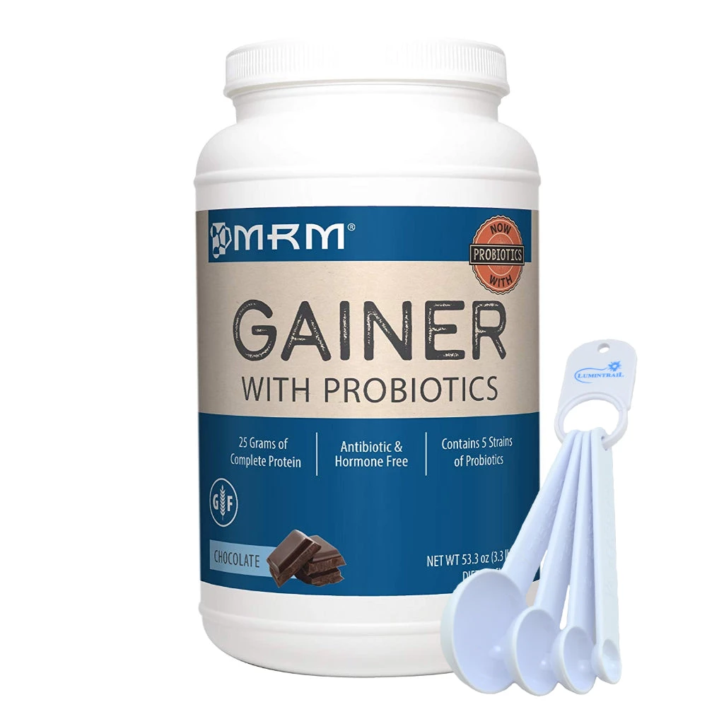 MRM Gainer Protein with Probiotics and BCAA’s, 53.3 oz Chocolate Bundle with a Lumintrail Measuring Spoon Set (1/4 tsp, 1/2 tsp, 1 tsp, and 1 tbsp)
