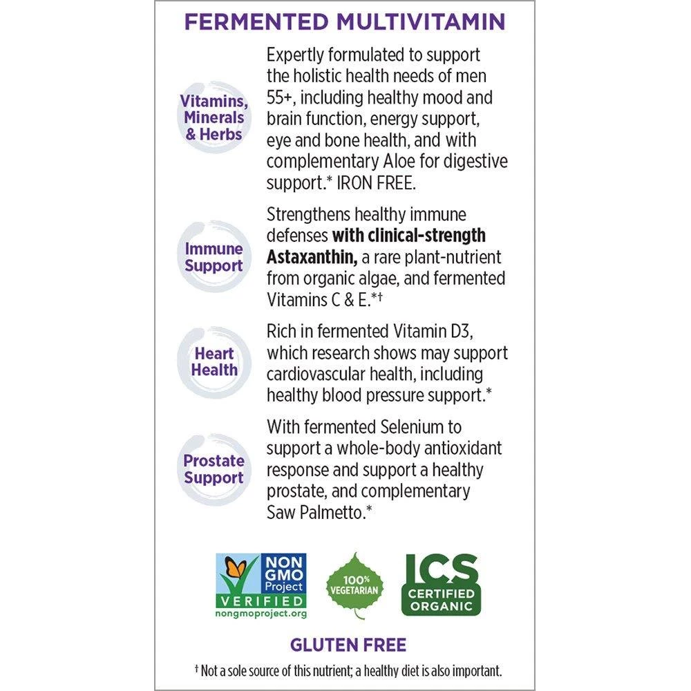 Every Man’s One Daily 55+ Multivitamin delivers Astaxanthin from organic Algae, Vitamins C, E, and D3, fermented Selenium and Saw Palmetto to support overall wellness for men aged 55+.* It is Iron-free and whole-food fermented. And our fermentation process unleashes Beta-Glucans, Nature’s own immune boosters, for your benefit.