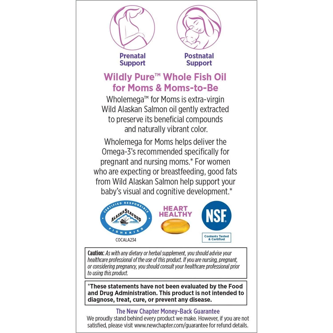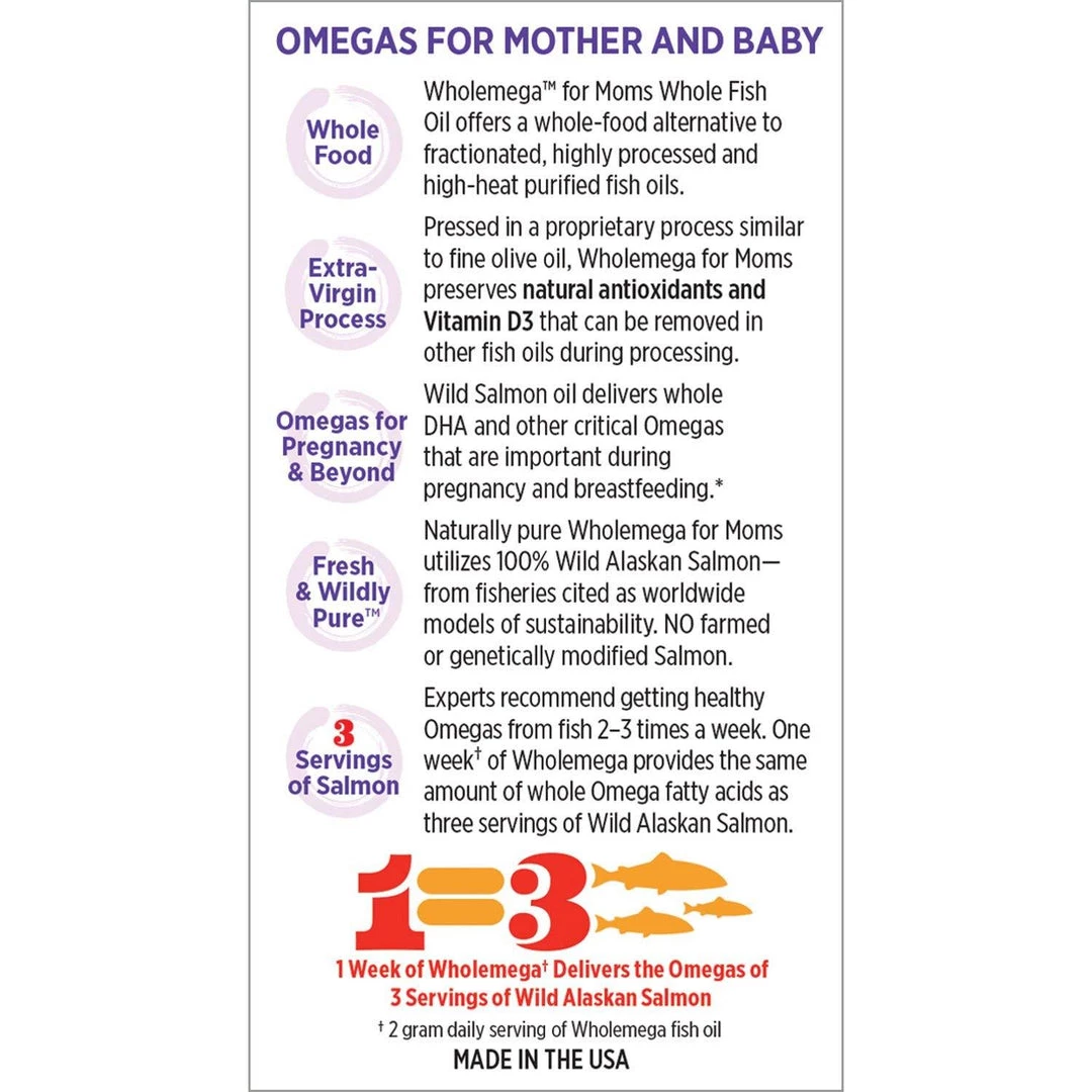 Wholemega for Moms is formulated specifically for prenatal and postnatal health, providing natural antioxidants, Vitamin D3, and 17 Omega fatty acids including Omega-3s. The fish oil is made with 100% Wild Alaskan Salmon fresh-pressed, Wildly Pure™, and sourced from sustainable fisheries.