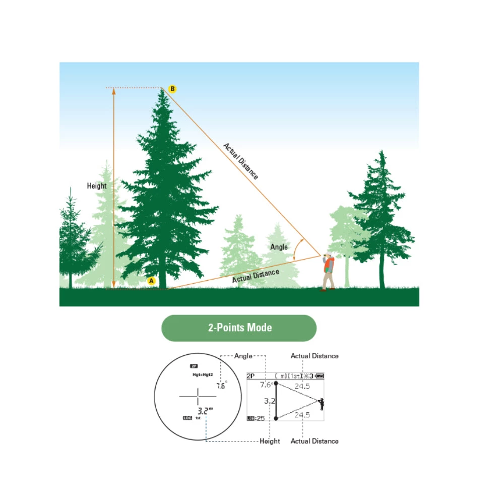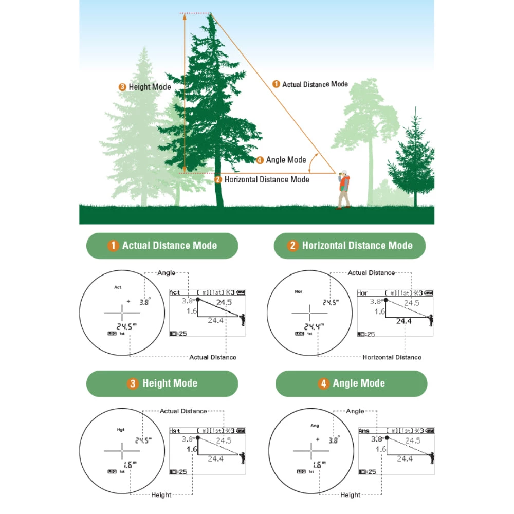 - Functions include actual distance, height, angle and vertical separation (difference in height between two targets) measurements as well as three-point measurement (height between two points).