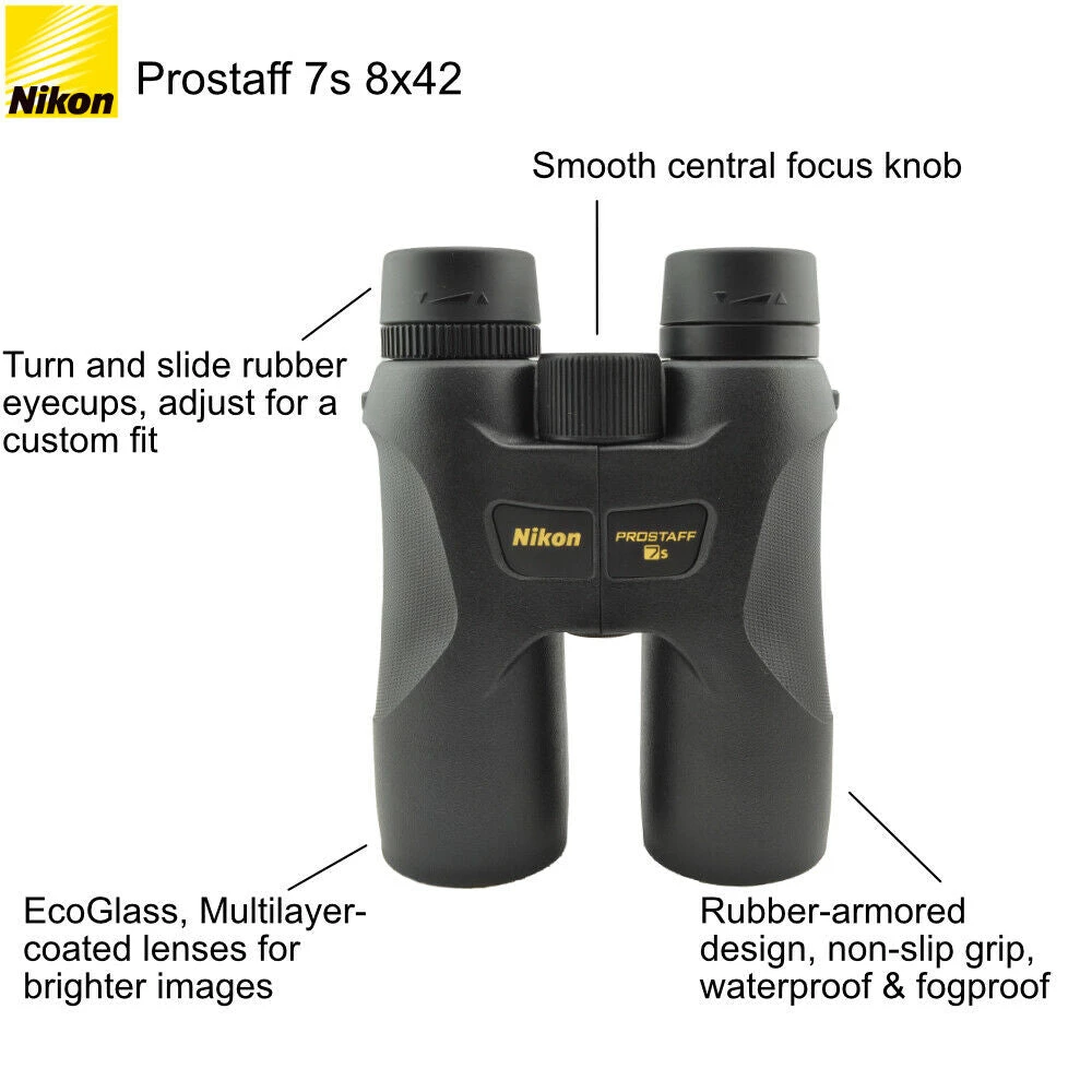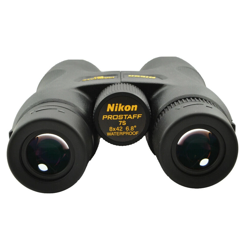 The Compact PROSTAFF 7S 8×42 Binocular with carry case, lens caps, and strap