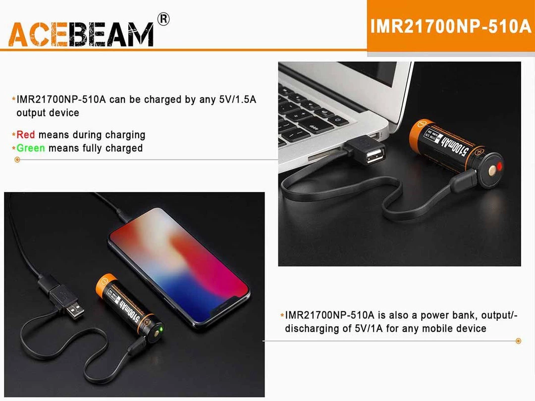 - USB-C RECHARGEABLE 21700 BATTERY: Come With a Rechargeable Battery Built-in USB-C Charging Port. instead of the charging port on flashlight in order to reduce the defects of the flashlight due to charging. The 21700 battery can also act as a power bank to charge mobile devices using the included cable