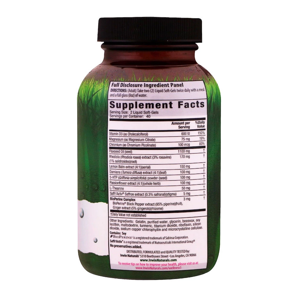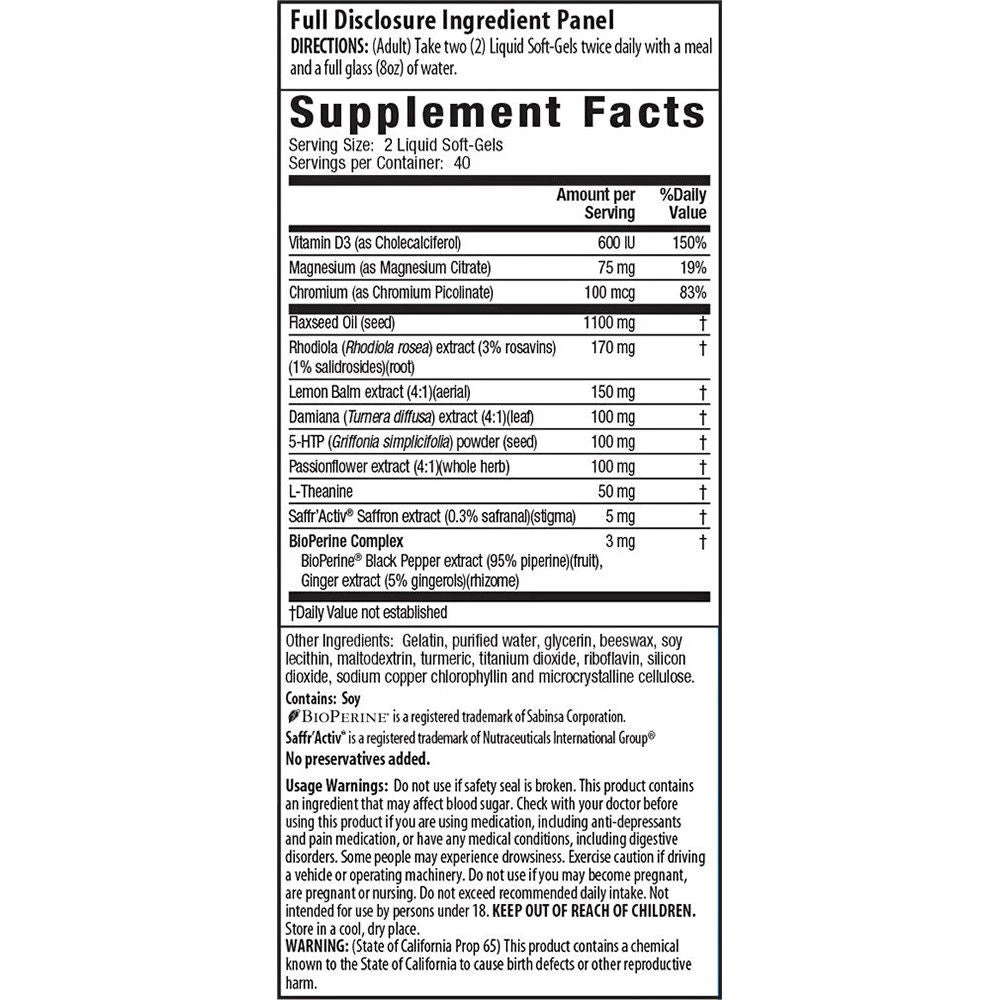 Active Ingredients: Vitamin D3, Magnesium, Chromium, Flaxseed Oil, Rhodiola, Lemon Balm extract, Damiana, 5-HTP, Passionflower extract, L-Theanine, Saffron extract
