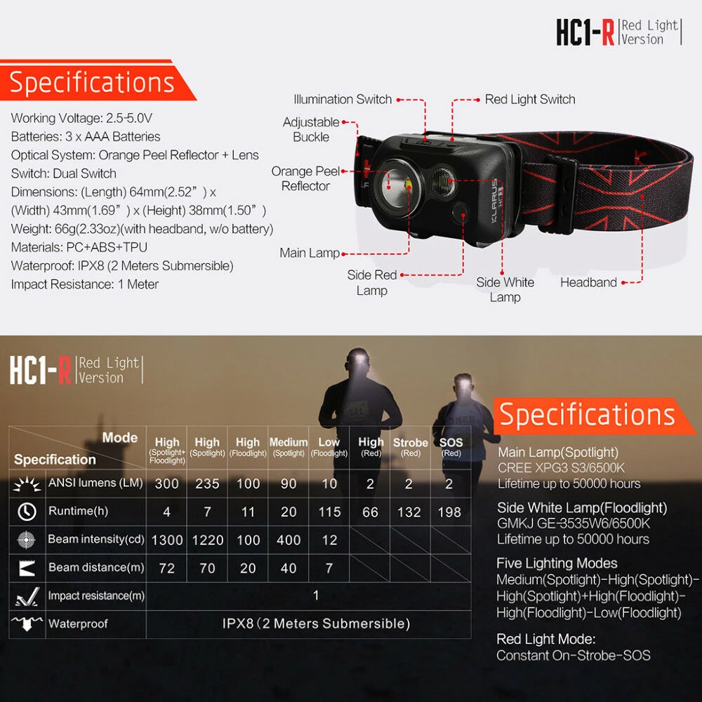 The HC1-R from Klarus is a lightweight dual color LED headlamp making it great for multiple applications such as climbing, running, camping, fishing and hiking.