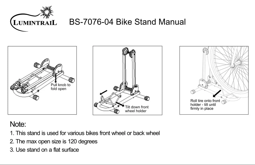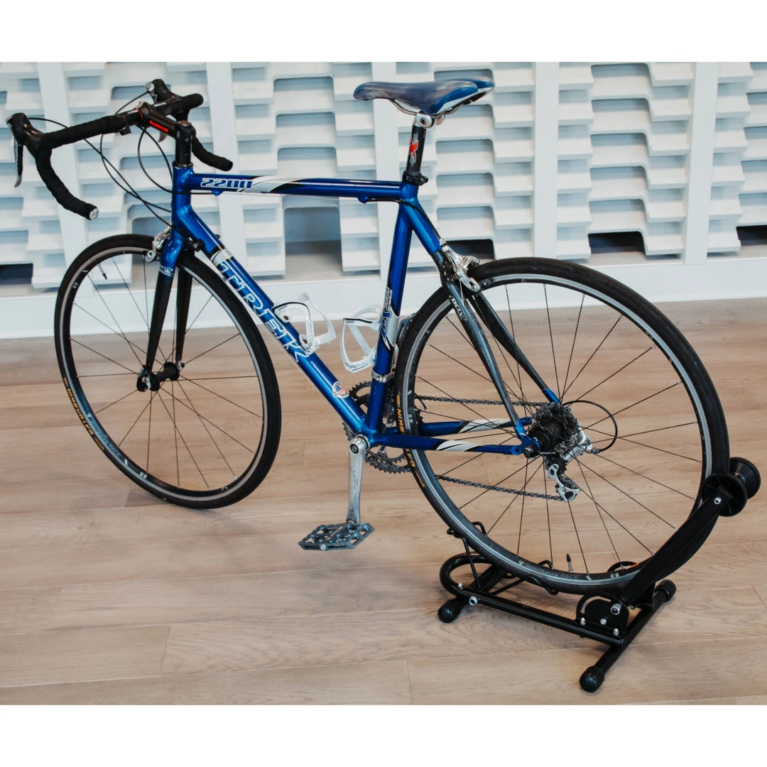 The Lumintrail Push-In Bike Floor Stand allows you to simply push your bike into the stand for a secure fit. With a unique front holder and three points of contact, you can feel confident that your bike will be safe when stored in your garage, apartment, house, and more.