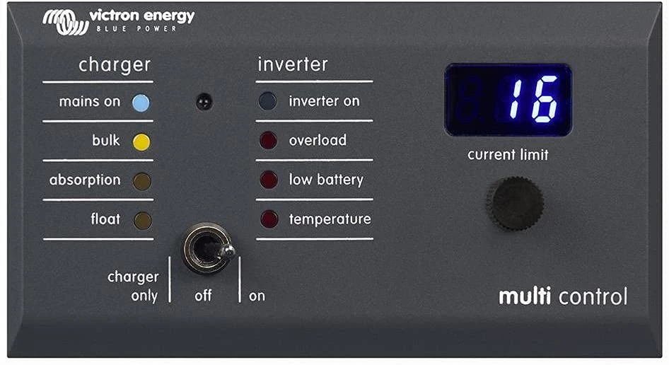 The Digital Multi Control is used to remotely view and adjust AC input currents, and turn on and off the Multi or Quattro. It is designed to integrate cleanly with your boat, vehicle or house system control panel.