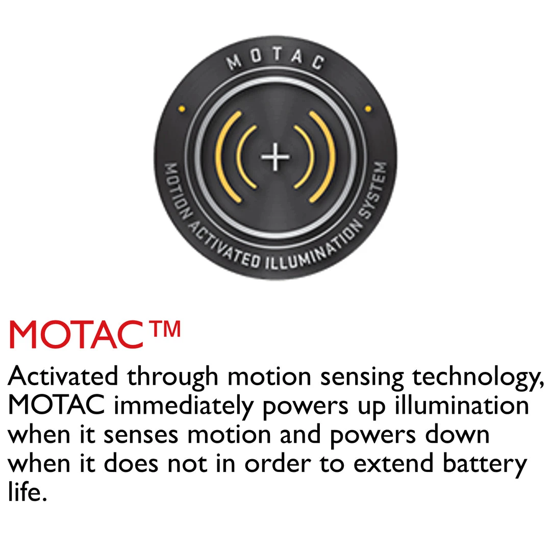 - MOTAC™ (Motion Activated Illumination) powers up when it senses motion and powers down when it does not. Provides for optimum operational safety and enhanced 62,500 hours of battery life in medium illumination setting
