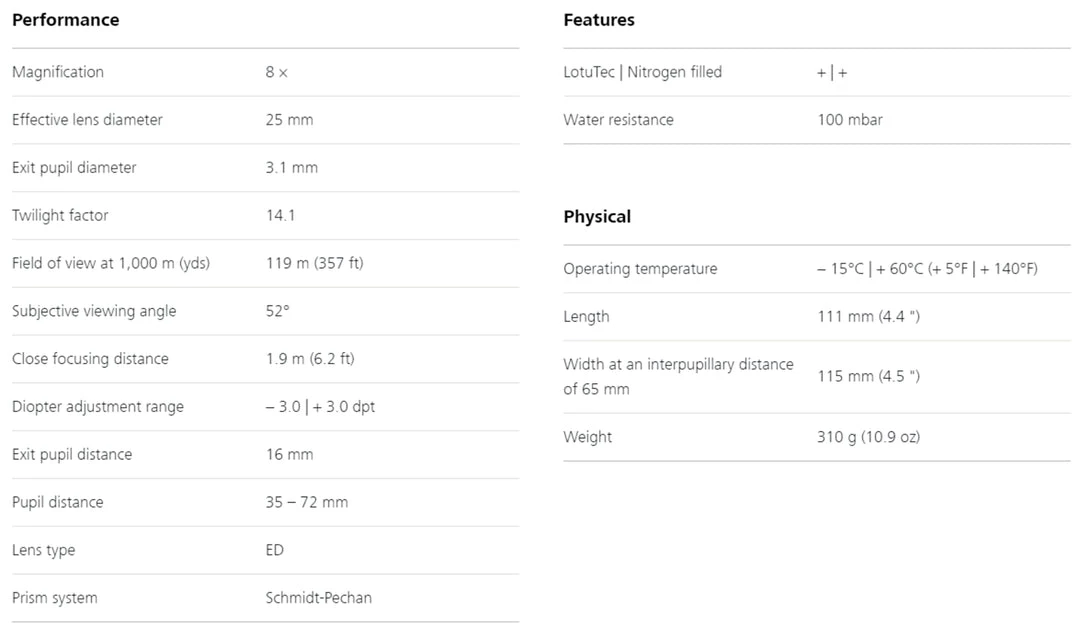 - ZEISS T* COATING: Guaranteed brilliant, high-contrast images, particularly in adverse light conditions and twilight. The coating is tuned to each lens individually for maximum clarity.