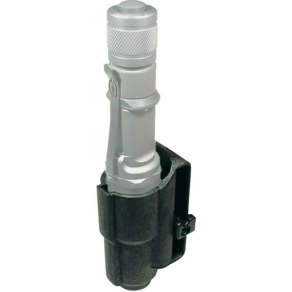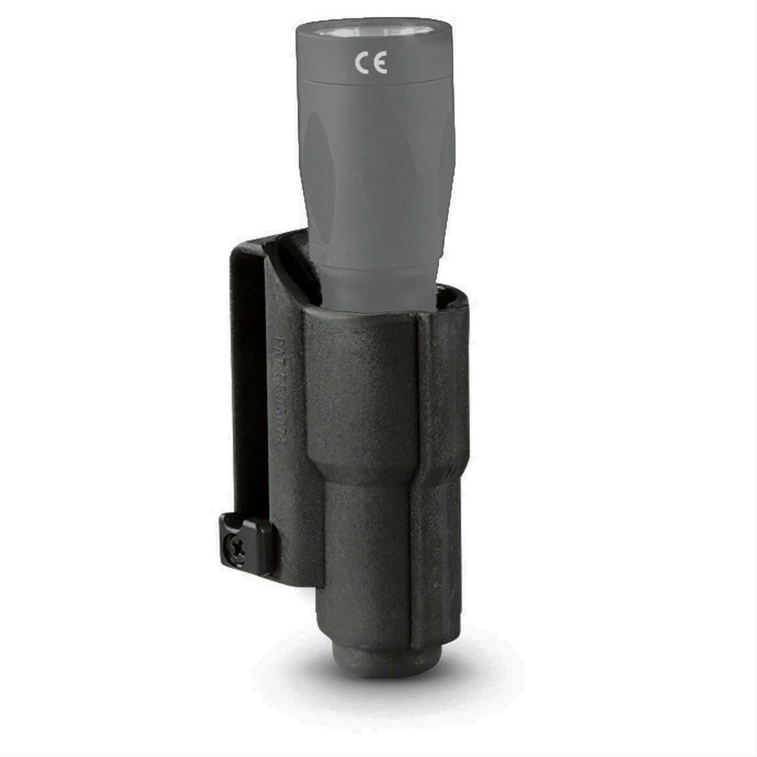 The patented V70 Speed Flashlight Holster allows the user to quickly access the flashlight from either a head-up or head-down position*. Rigid polymer construction protects your light from impact while ensuring an “open mouth” for fumble-free re-holstering. An adjustable spacer allows the molded-in belt slot to be fitted to belts up to 2.25″ wide.