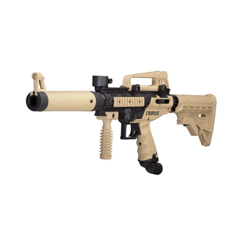 The new Tippmann Cronus .68 Caliber Paintball Marker Black & Tan combines high performance with incredible durability. The Cronus features our reliable in-line bolt system in a high-impact composite body with soft over molded rubber grips. Three main mods, including a mock silencer, carry handle, and adjustable stock.