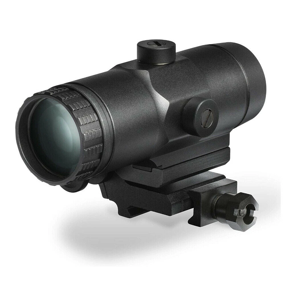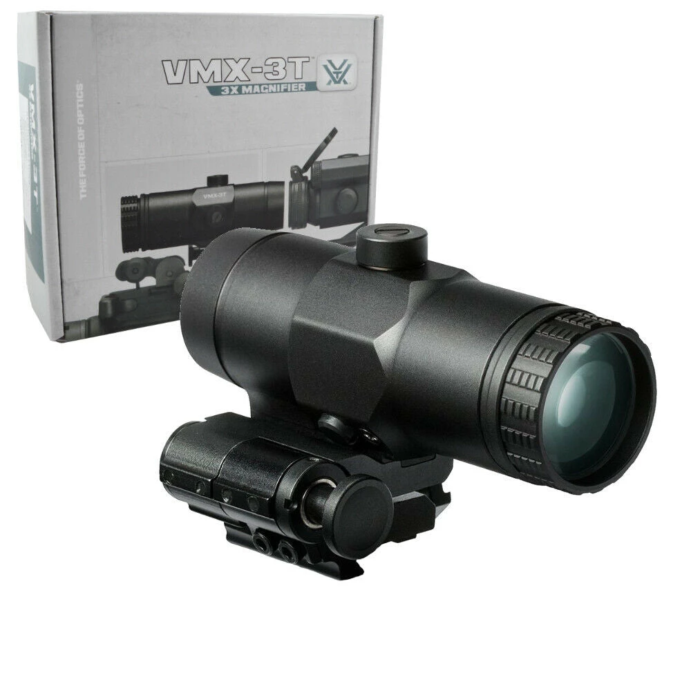The push-button design of the VMX-3T engages and disengages the flip-mount, allowing the magnifier to lock in place. The result, 3x magnified or unmagnified views at will. Optics are fully multi-coated for optimal light transmission. Lightweight and tough, hard-coat-anodized machined-aluminum construction ensures durability.