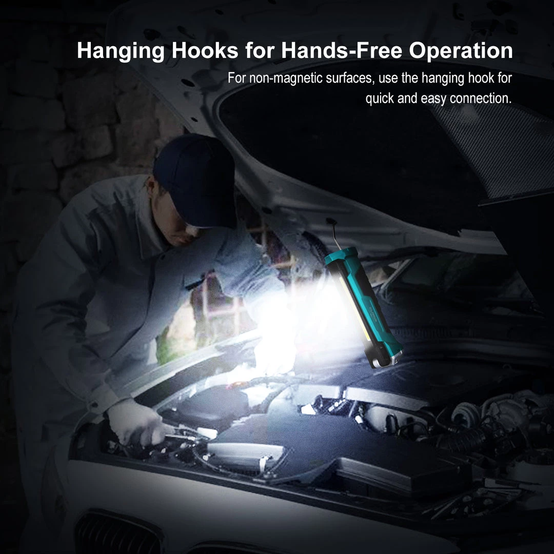 - 7 LIGHT MODES: 5 Work Lighting modes: Medium White/ High White/ Low White/ Red Warning/ Red Strobe. 2 Flashlight modes: High Brightness Front Light / Medium Brightness Front Light. COB light source + flashlight. 2 using modes, ideal for camping, car maintenance, inspection, and emergency use.