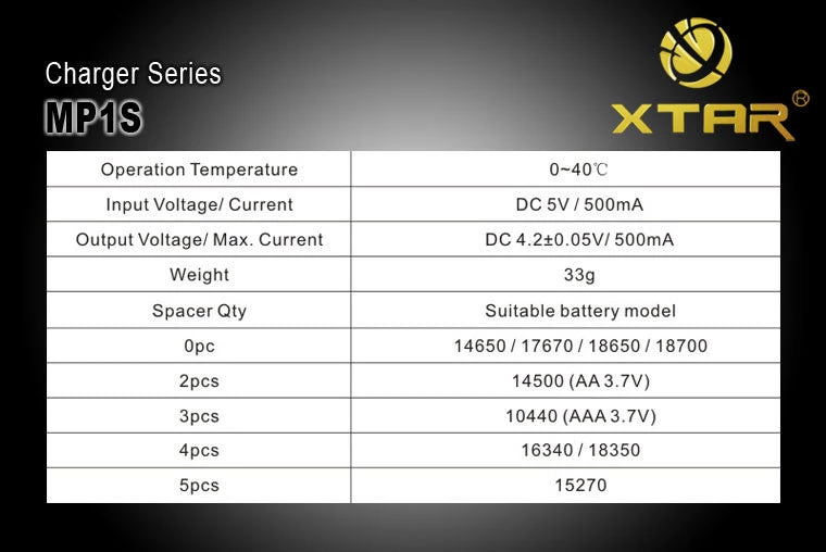 XTAR MP1S Intelligent USB 14650/17500/17670/18350/18650/18700 Battery Charger